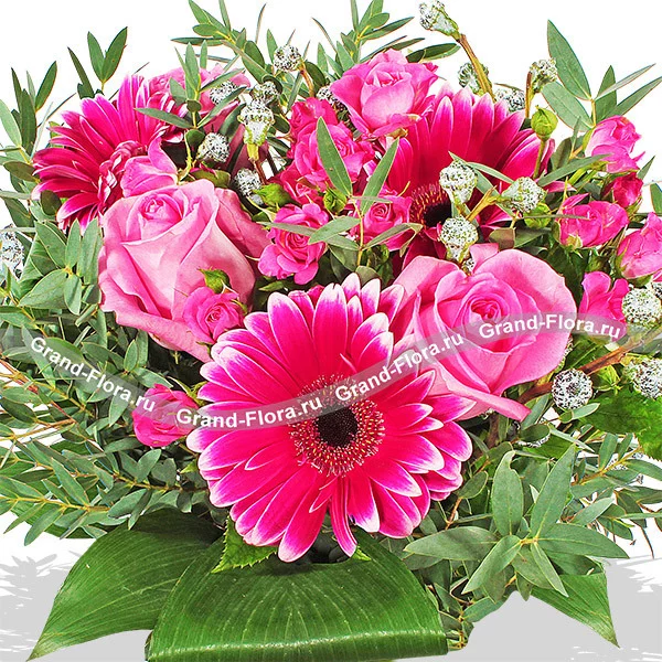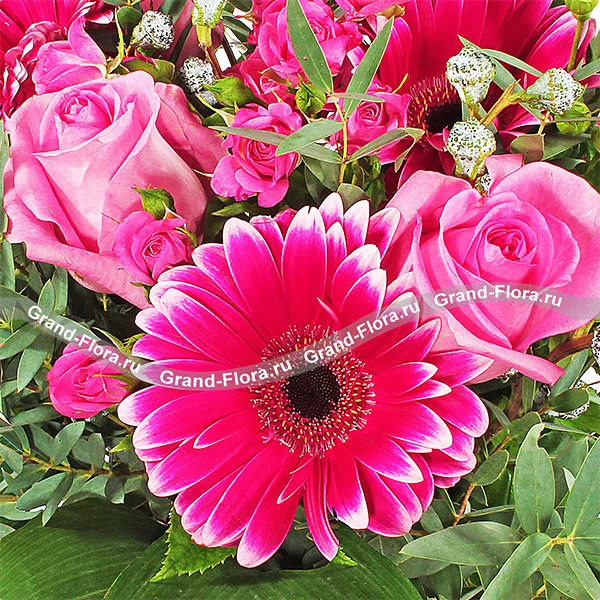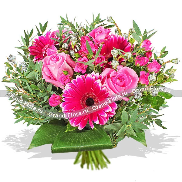 Стандартный (на фото): малиновая гербера - 3шт., роза розовая - 3шт., роза розовая кустовая - 2шт., декоративная зелень, сетка.