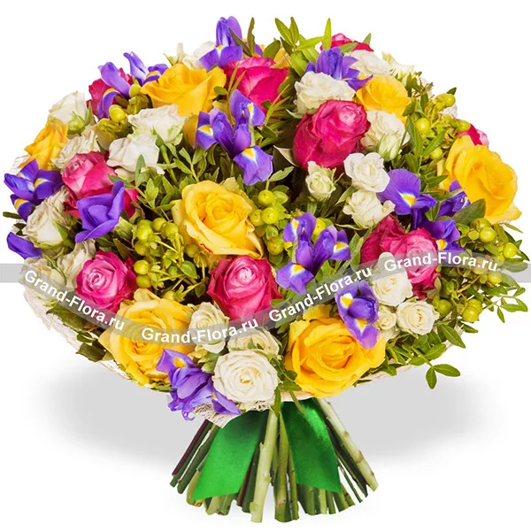 Стандартный: роза розовая - 3 шт., роза желтая - 2 шт., ирисы - 5 шт., роза кустовая белая - 2 шт., гиперикум - 3 шт., декоративная зелень., упаковка, лента.