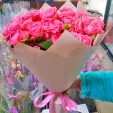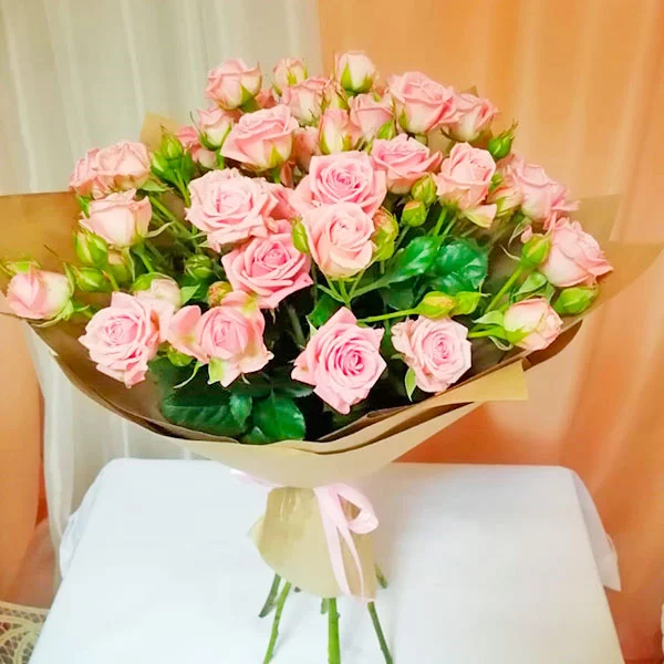 (на фото) роза кустовая розовая - 15 шт, упаковка, лента розовая. Примерный размер: 35Х35 см.
