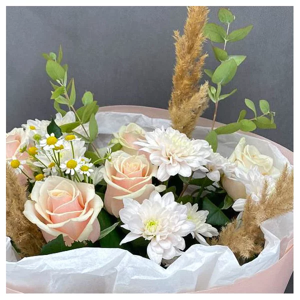 Стандартный (на фото): роза кремовая/персиковая(персиково-розовая) - 5 шт., хризантема белая - 4 шт., декоративная зелень, упаковка, лента.